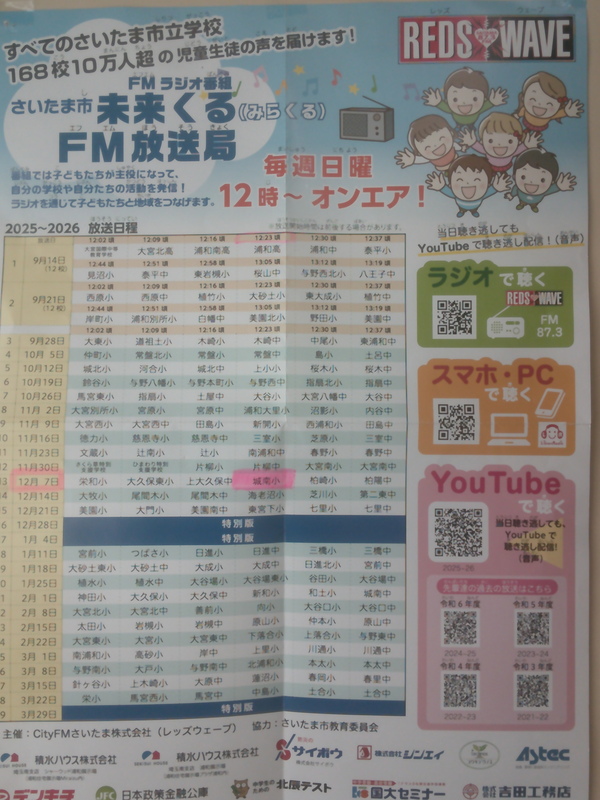 本日(12/ 7)未来くるFM放送局(ラジオ)にて城南小が紹介されました。放送に協力してくれたのは放送委員会の子どもたちです。45周年を迎えたことや和太鼓クラブの活動などを紹介しました。子どもたちの声で学校を保護者や地域の皆様にお伝えでき、とても良かったです。放送委員のみなさん、楽しい放送をありがとうございました。