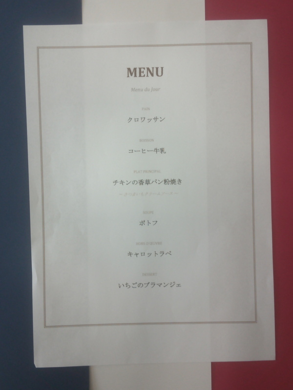 Menu du Jour (本日のメニュー):PAIN クロワッサン BOISSON コーヒー牛乳 PLAT PRINCIPAL チキンの香草パン粉焼き~さつまいもクリームソース~ SOUPE ポトフ HORS-D'CEUVRE キャロットラぺ DESSERT いちごのブラマンジェ